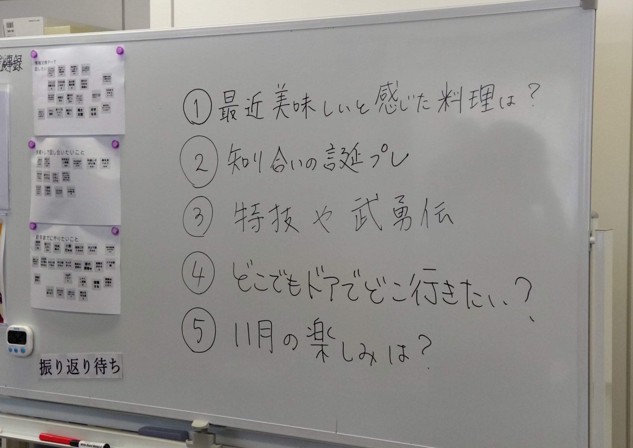 前週のブレインストーミングの時間に、「他の人に聞いてみたい」話題を皆で出しあいました。その中で人気のあった&気になるお題に沿って、今週は自由に話し合います。